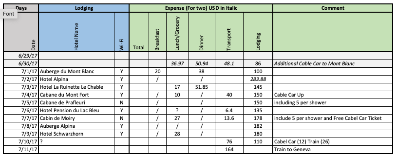 这是我之前做的行程和住宿安排的表格,以供后人参考。